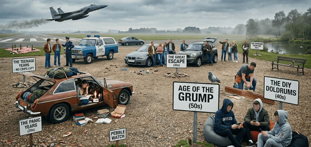 And I must say, there is nothing quite like eating a sandwich while a fighter jet screams overhead doing Mach goodness gracious, rearranging your internal organs with the sheer force of its engines. Sensible people would run. We, however, laughed. Because at that age, you believe you are immortal, invincible, and frankly more intelligent than anyone in uniform.